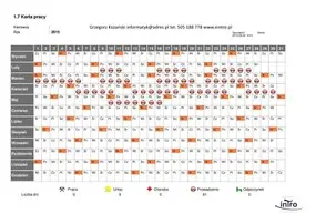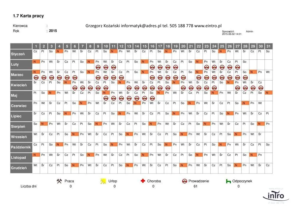 Na karcie pracy kierowcy znajduje się graficzne podsumowanie pracy, urlopu, choroby oraz prowadzenia auta wraz z odpoczynkiem liczone w liczbach dni od stycznia do grudnia. Ewidencja roczna służy do rozliczania czasu pracy.