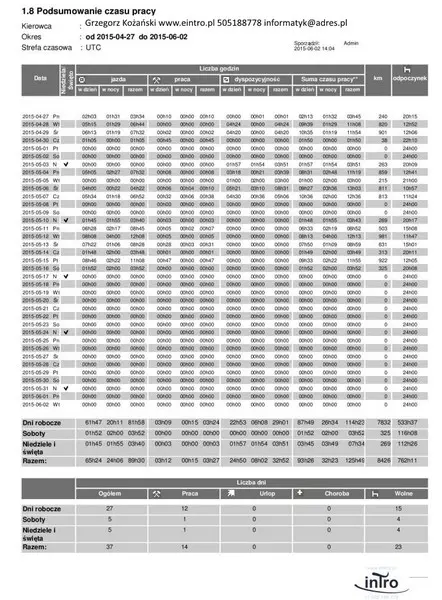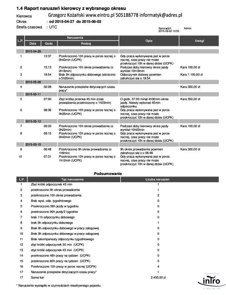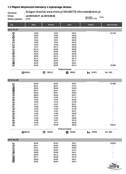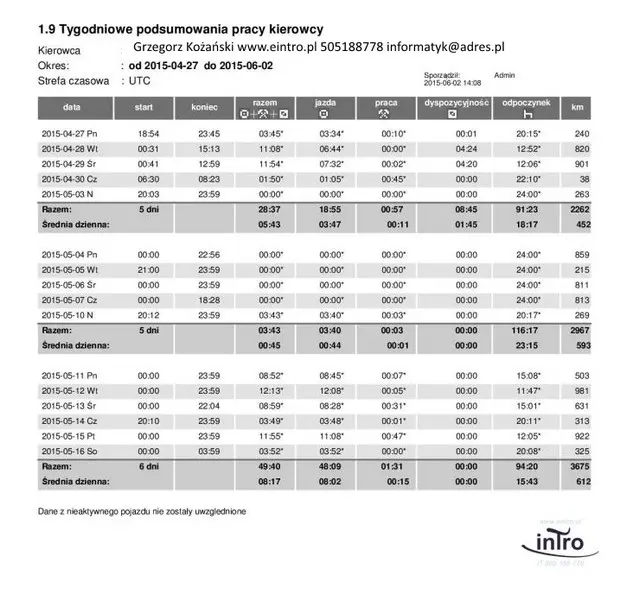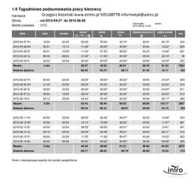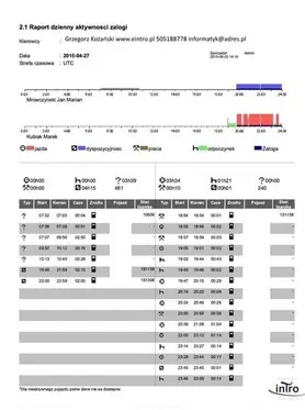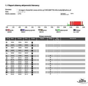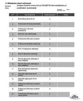 Analiza pracy kierowców wykonywana jest na podstawie dostarczonych plików źródłowych, archiwalnych lub bezpośrednio z karty kierowcy. Wydruk dostarczany jest bezpośrednio w wersji papierowej lub przesyłana na wskazany adres email w pliku pdf do samodzielnego wydruku.